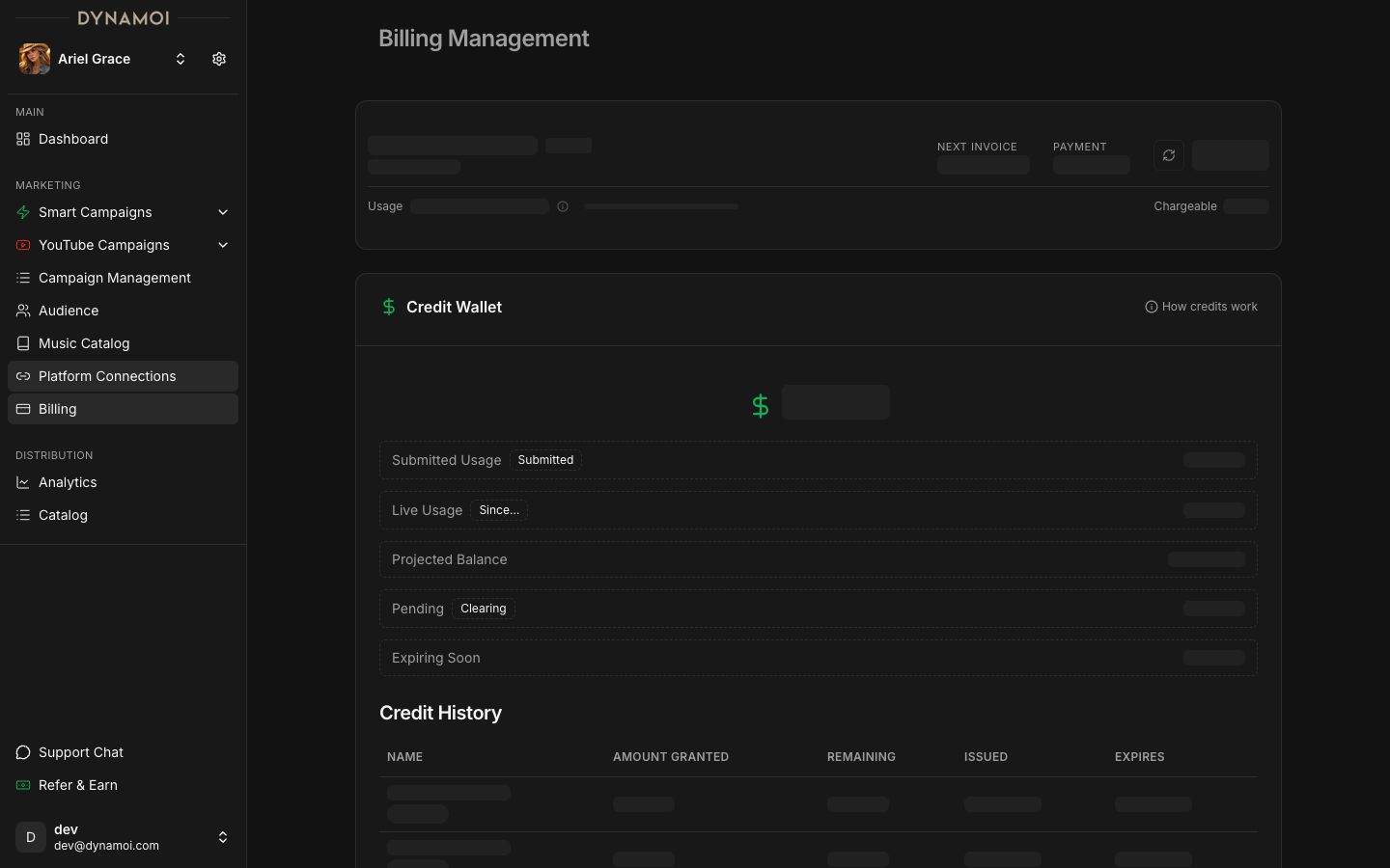 Dynamoi operates on a "No Agency Fees" and "100% Ad Credit" model. Subscription dollars load credits, and credits are applied to ad spend before usage charges hit the payment method on file.