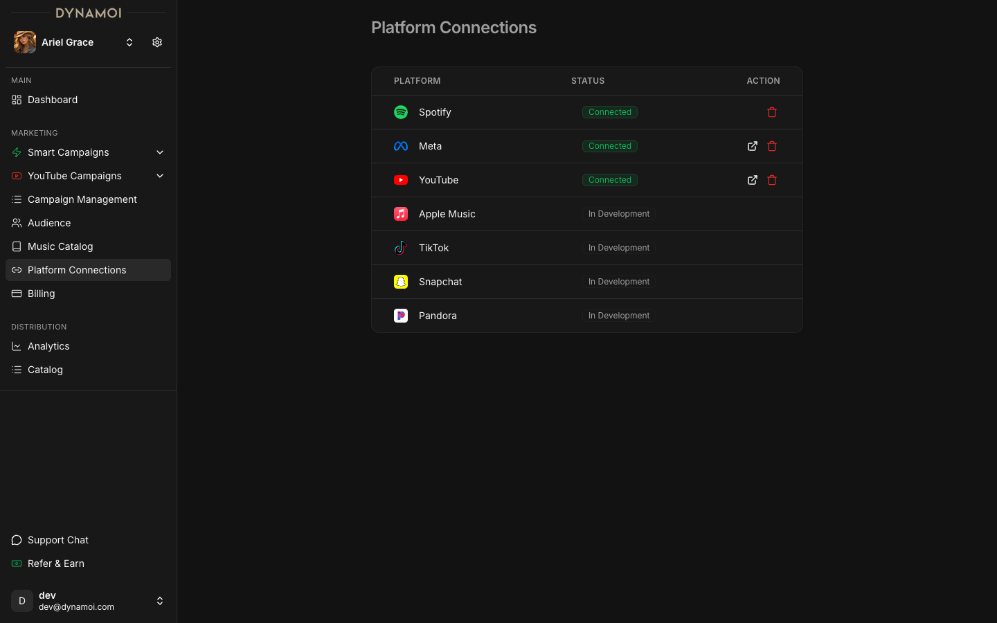 Go to Marketing and select Campaign Management from the sidebar. This page shows all campaigns for the current artist, organized by status.